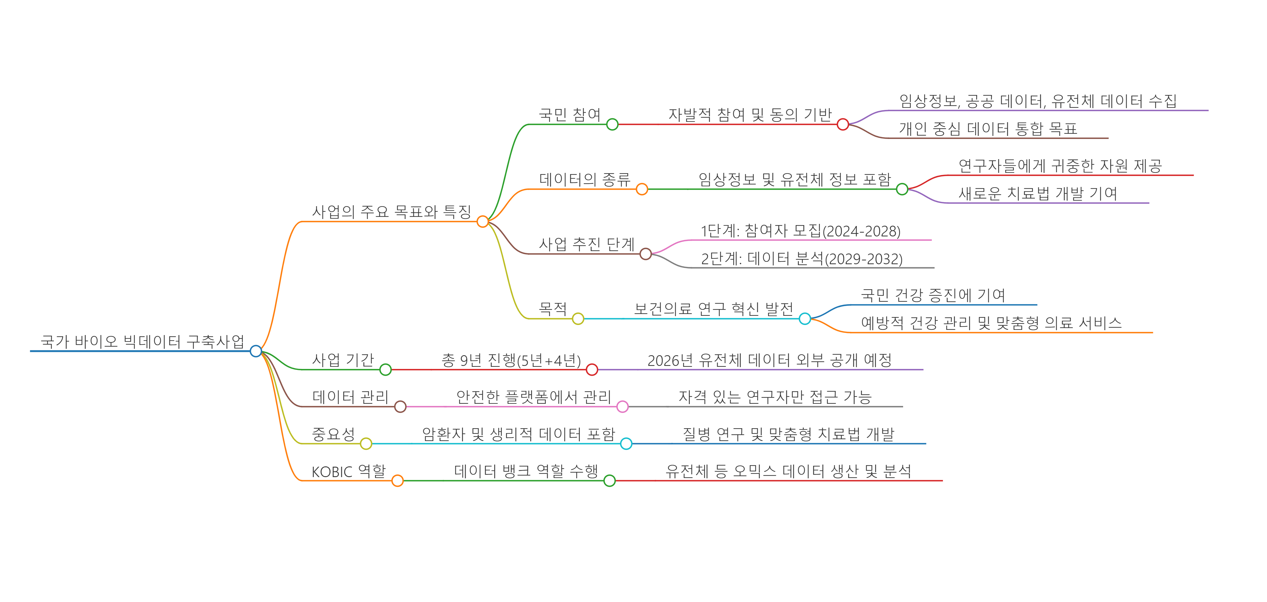 - 사업 추진 단계: 이 사업은 1단계와 2단계로 나뉘어 있으며, 2024년부터 2028년까지는 참여자를 모집하고, 2029년부터 2032년까지 데이터를 분석하여 실제 의료 및 연구에 활용하는 계획입니다69.