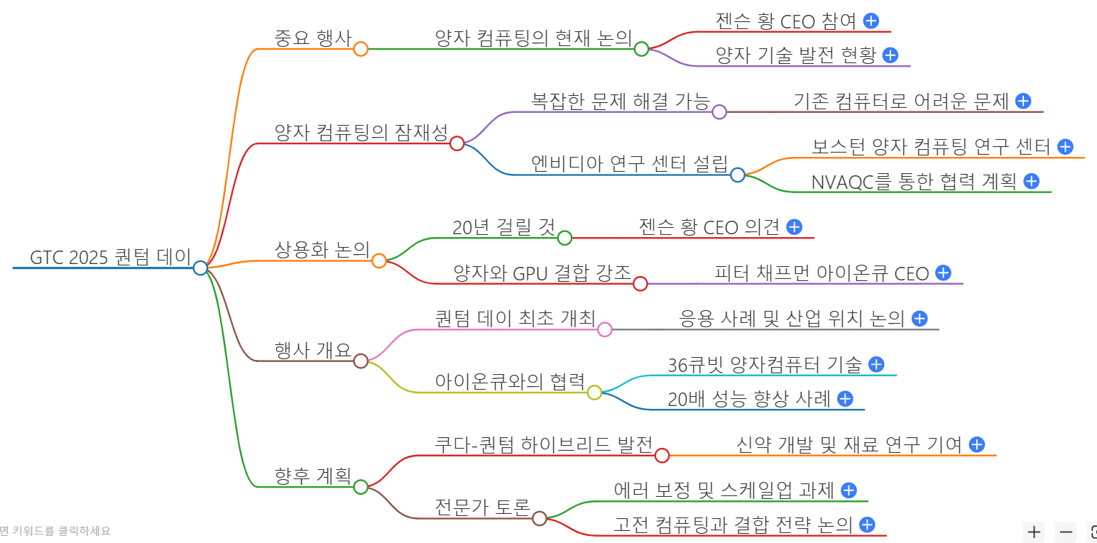 또한, 엔비디아는 향후 양자 컴퓨터의 성능을 더욱 향상시키기 위해 '쿠다(CUDA)-퀀텀 하이브리드 컴퓨팅'을 발전시키는 계획을 밝히며, 이를 통해 신약 개발 및 재료 연구와 같은 실질적인 문제를 해결하는 데 기여할 것이라고 설명했습니다23. 이와 관련하여 전문가들과의 토론에서는 양자 컴퓨터의 에러 보정 및 스케일업 과제, 고전 컴퓨팅과의 결합 전략 등이 논의되기도 했습니다23.