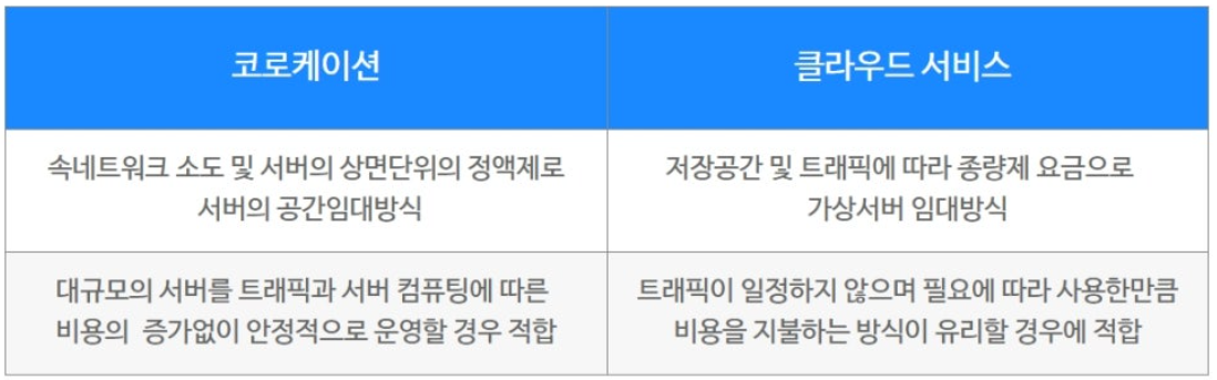 | 비용 구조 | 시설 이용료 (서버는 소유) | 서버 임대료 포함 |
