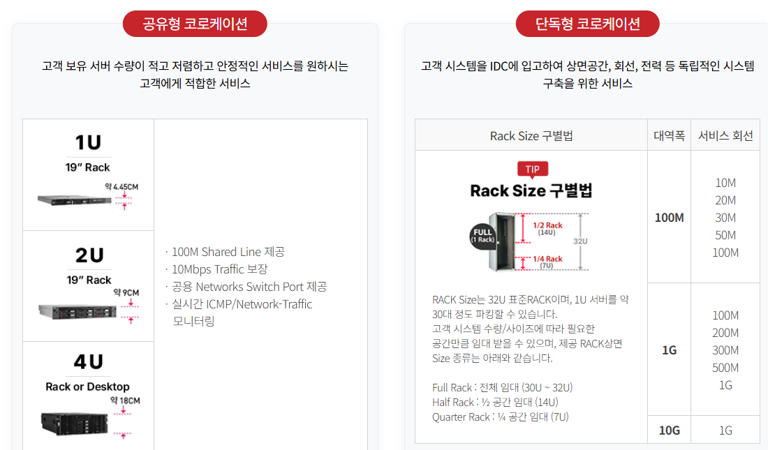 | 서비스 내용 | 자사 서버 설치 공간 임대 | 자사 서버 설치 랙 임대 | 사업자 서버 임대 | 클라우드 서버/스토리지 이용 |