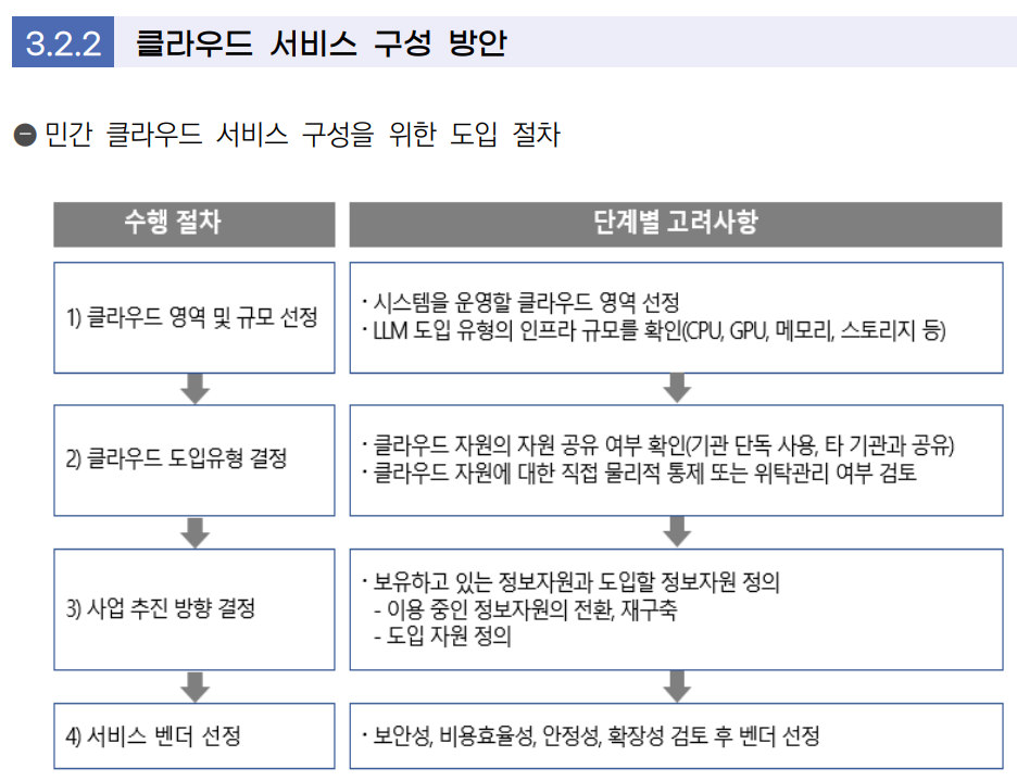 가이드라인 내 ‘초거대 AI 도입 절차’에서는 각 기관의 초거대 AI 인프라 구축 방식으로, 범정부 공통기반 활용, 자체 구현방안 등을 제시하고, 정부의 ‘국가 망 보안체계’ 도입과 관련하여 데이터 보안등급 분류 및 보안 통제 항목 등을 추가하였다. 그리고 최신의 답변 생성 등 최근 확대되고 있는 ‘검색증강생성’(RAG) 기술을 AI 도입 시 데이터 학습방식으로 새롭게 추가하고 백터DB 구축 등 고려사항을 안내하고 있다.