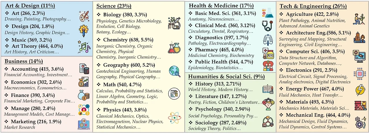 - 모델이 다양한 양식에서 정보를 인식하고 이해할 수 있을 뿐만 아니라 주제별 지식을 통해 추론하여 솔루션을 도출하는 능력을 평가하는 것을 목표로 합니다.