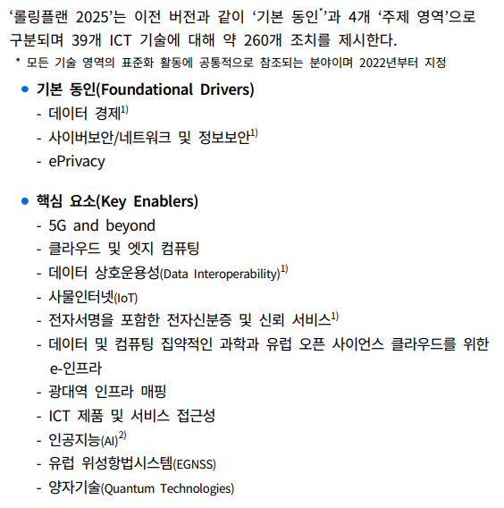 롤링플랜은 EU의 디지털 단일 시장(Digital Single Market, DSM) 전략과 밀접하게 연관되어 있으며, EU의 주요 정책 목표를 지원하는 데 중요한 역할을 수행한다. 특히, 사이버 보안, 데이터 경제, e-프라이버시 등의 분야에서 표준의 중요성을 강조하며, 다양한 이해 관계자들의 참여와 국제 협력을 장려한다.