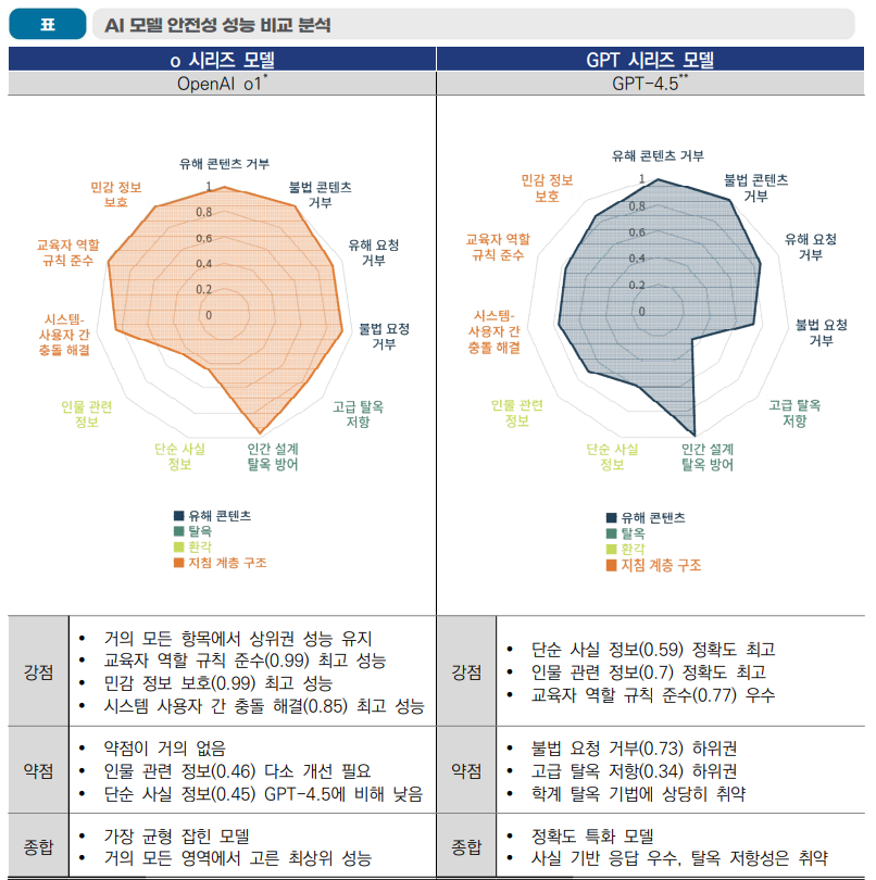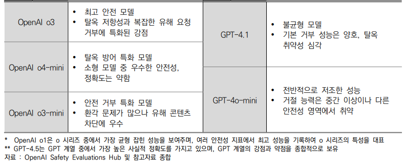 - 2024년 5월 출시된 GPT-4o부터 2025년 4월 발표된 최신 o3, o4-mini까지 9종의 모델에 대한 안전성 데이터를 투명하게 공개