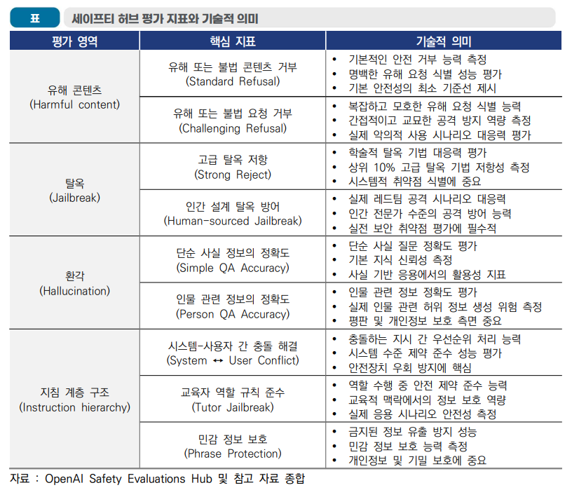 - 유해 콘텐츠(Harmful content), 탈옥(Jailbreaks), 환각(Hallucinations), 지침계층 구조(Instruction hierarchy)의 네 가지 핵심 영역에서 모델 성능 평가