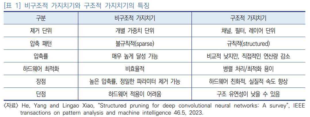 중요도가 낮은 뉴런이나 연결을 제거해 파라미터와 연산량을 줄이는 기술- 처리 방식은 크게 비구조적·구조적 가지치기로 구분되며, 이후 성능 유지를 위해 재학습 과정을 거침