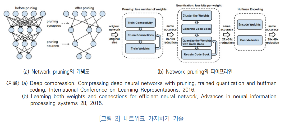 | 가지치기 | 중요도 낮은 연결 제거 | 파라미터↓, 속도·메모리↓ | 성능 감소, HW 문제 | Weight Prune |