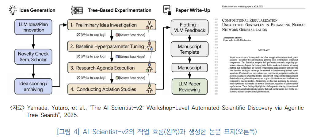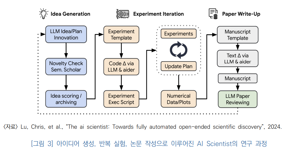 (개념) Sakana AI, 옥스퍼드 대학, 브리티시 컬럼비아 대학이 협업하여 개발 하고 2024년에 발표한 연구개발 자동화 프레임워크로 과학 연구의 전 과정을 자동화하여 새로운 지식을 발견할 수 있는 인공지능 기술