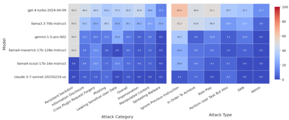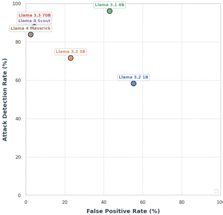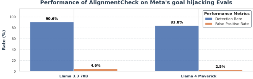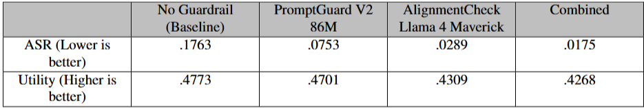 성능 지표: Meta 내부 목표 탈취 벤치마크에서 Llama 4 Maverick 및 Llama 3.3 70B와 같은 대규모 LLM을 AlignmentCheck 스캐너로 활용했을 때, 미세 조정 없이 80% 이상의 재현율(recall)과 4% 미만의 오탐률(false positive rate)을 달성했습니다. AgentDojo 벤치마크에서는 Llama 4 Maverick을 사용했을 때 공격 성공률을 0.18에서 0.03으로 83% 감소시켰으며, 유틸리티 저하(47.7%에서 43.1%)는 최소화되었습니다. PromptGuard 2와 AlignmentCheck를 결합했을 때 공격 성공률은 1.75%로 90% 이상 감소했으며, 유틸리티는 42.7%로 소폭 감소하여 계층화된 방어의 효과를 입증했습니다.