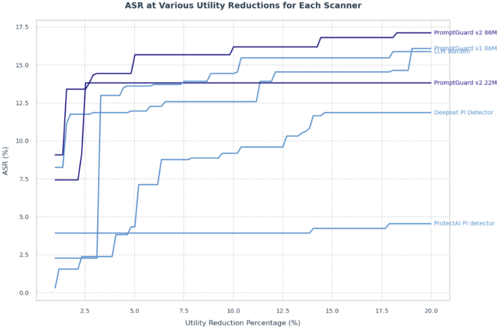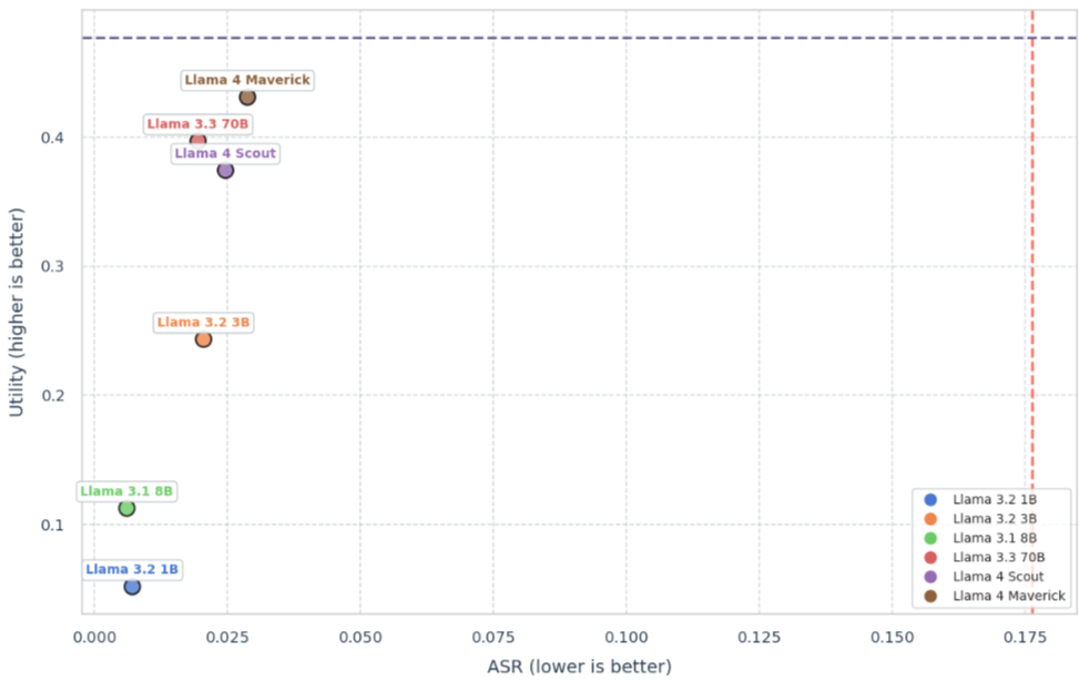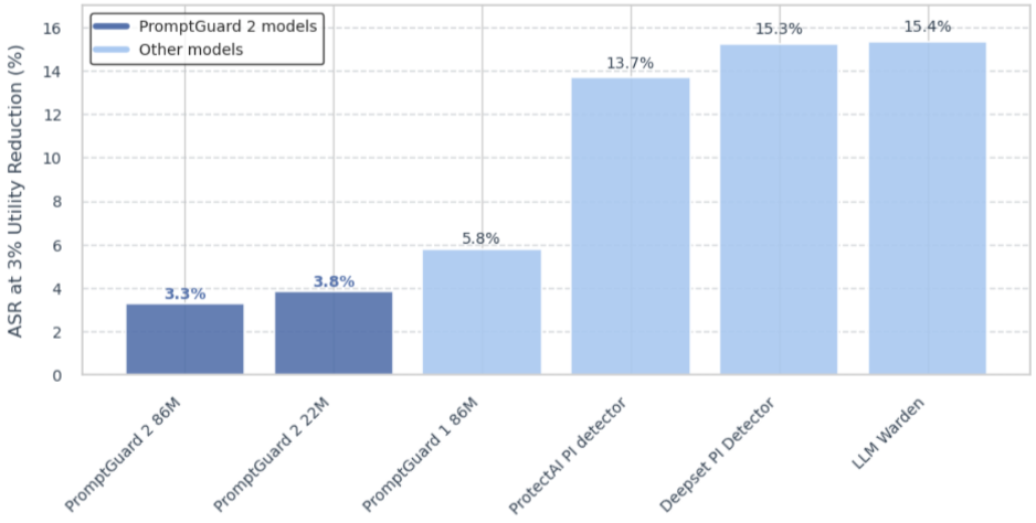 성능 지표: 직접 탈옥 탐지 평가에서, 독점 벤치마크를 사용한 결과 PromptGuard 2 86M은 영어 데이터셋에서 AUC 0.98, 1% FPR에서 Recall 97.5%를, 다국어 데이터셋에서 AUC 0.995를 달성했습니다. PromptGuard 2 22M은 낮은 지연 시간(19.3ms)에도 불구하고 유사하게 강력한 성능을 보였습니다. AgentDojo 벤치마크에서는 PromptGuard V2 86M 단독으로 공격 성공률(ASR)을 17.6%에서 7.5%로 57% 감소시켰으며, 유틸리티 손실은 미미했습니다.