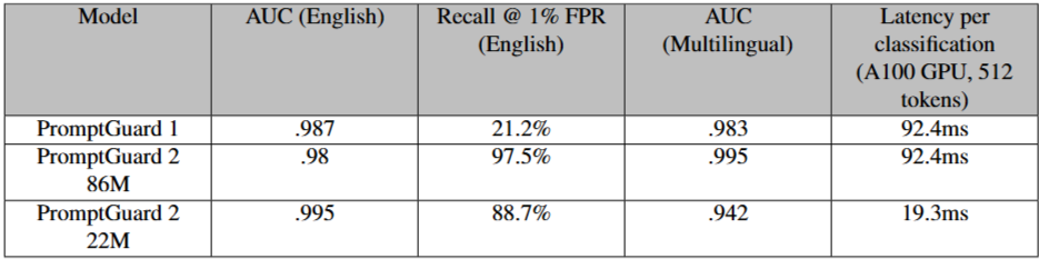 모델 아키텍처 및 개선 사항: PromptGuard 2는 86M(mDeBERTa-base 기반) 및 22M(DeBERTa-xsmall 기반) 매개변수 변형을 포함합니다. PromptGuard 1이 광범위한 목표 탈취 탐지를 시도하여 문맥 부족 시 오탐(false positive)을 초래했던 것과 달리, PromptGuard 2는 명시적인 탈옥 기술 탐지에만 집중하여 정밀도와 사용성을 향상시켰습니다.