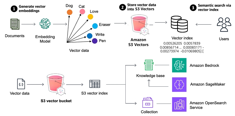 (개념) 별도의 벡터 데이터베이스 인프라를 설정하지 않고 S3 스토리지의 벡터 버킷에 담는 것만으로 LLM의 벡터 데이터 활용이 가능