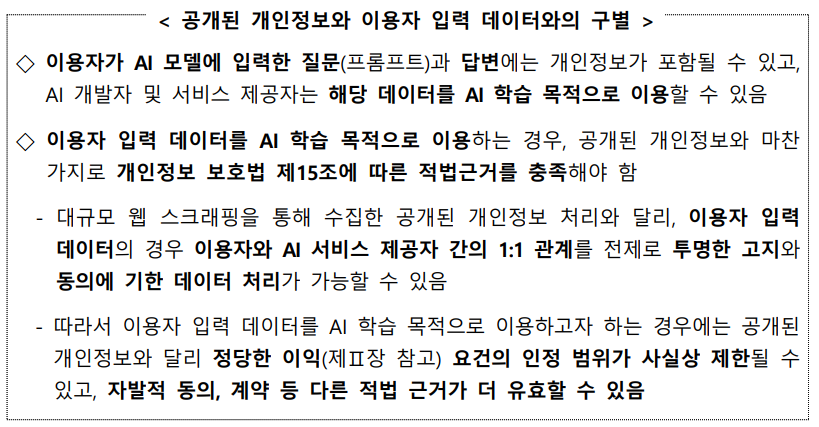 | AI 학습 데이터로 활용 시 | 개인정보 포함 여부에 따라 적법한 처리 필요. 특히 비식별 조치 및 목적 외 이용 금지 의무 고려 |