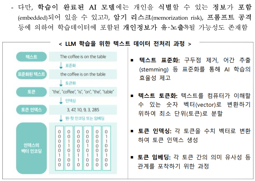 | 생성 AI 모델 학습 시 | LLM 등의 대규모 모델은 개인정보 암기 가능성 존재. 이에 따른 보완조치 필수 (입력 필터링, 학습 제한 등) |