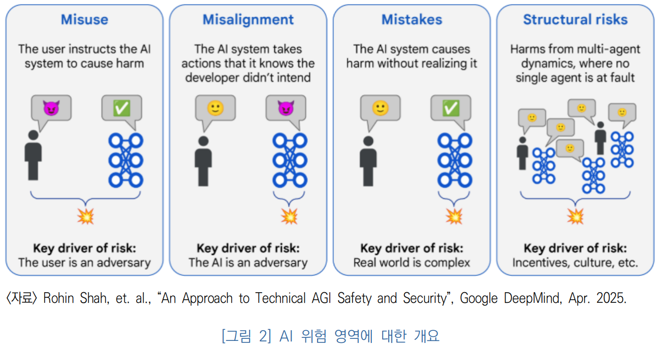 - 이에 따라 안전 개념은 단순한 시스템 오류를 넘어서, 사회적 영향력, 자율적 행동 가능성, 통제 불가능성, 정보 유출 및 허위정보 생성 가능성까지 포함하는 확장된 개념으로 진화함.