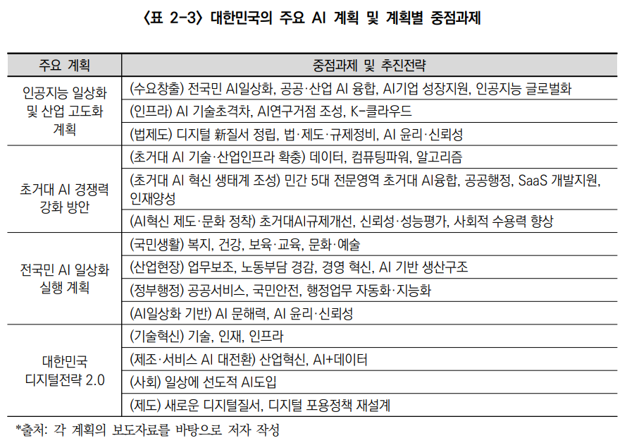 〈표 2-3〉 대한민국의 주요 AI 계획 및 계획별 중점과제 27