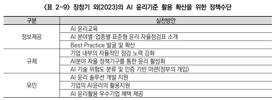 〈표 2-9〉 장창기 외(2023)의 AI 윤리기준 활용 확산을 위한 정책수단 36