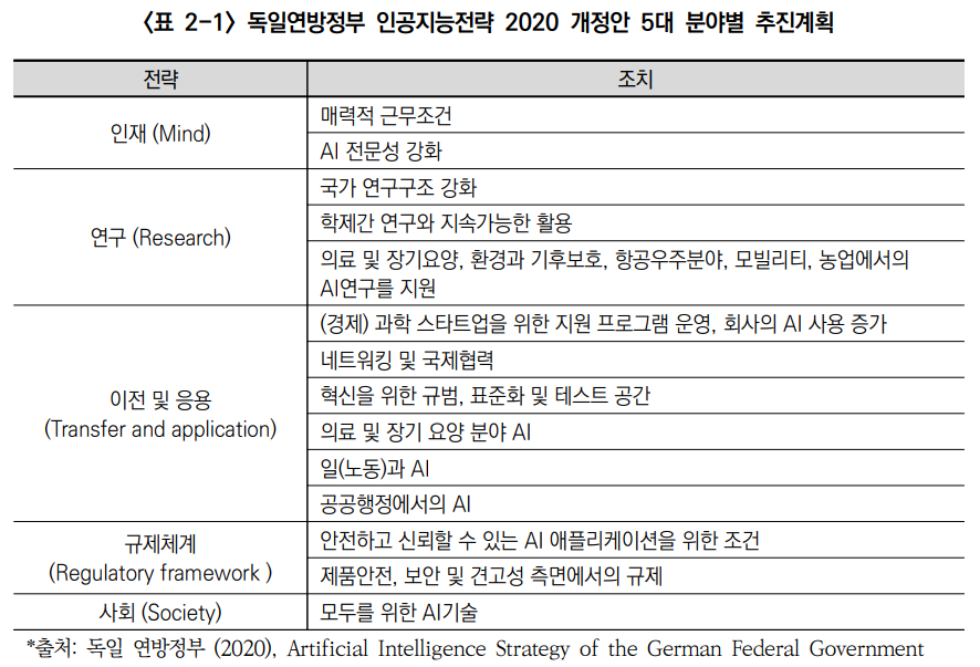 〈표 2-1〉 독일연방정부 인공지능전략 2020 개정안 5대 분야별 추진계획 25
