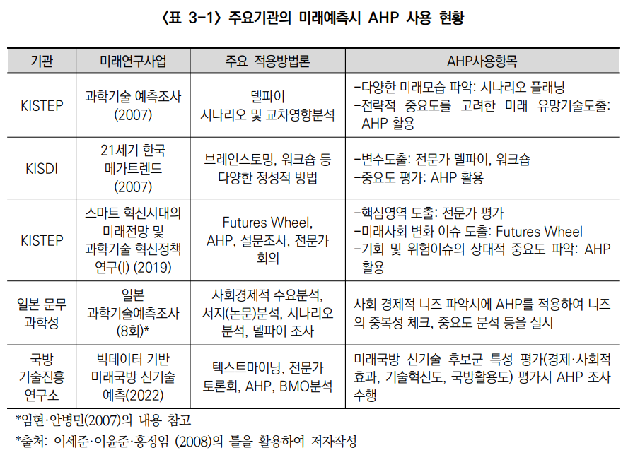 〈표 3-1〉 주요기관의 미래예측시 AHP 사용 현황 44