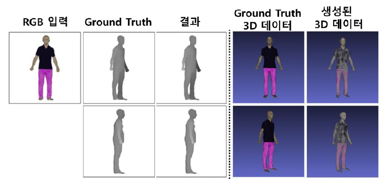 그림 9는 그림 8의 학습모델에 의해 생성된 결과를 보여준다. 사진 한 장을 입력하여 생성된 3D 모델로, 간단한 후처리를 통해 게임 및 애니메이션의 조연급 객체로 사용할 수 있다.