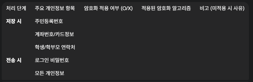 - 아래 표의 형식에 맞춰, 플랫폼 내 개인정보 항목별 암호화 현황을 제출할 것