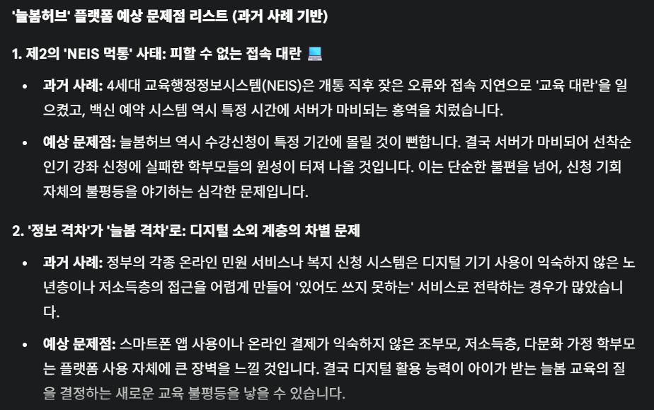 위에서 찾아 준 아이템 중에, <늘봄학교 ‘늘봄허브’ 플랫폼의 실질적 운영성 검증 부족> 아이템을 좀 더 깊게 알아봐야겠습니다. 과거의 사례를 참고해서 문제를 예상해보라고 했습니다. 늘봄허브에 대해서도 알려줘야 할 것 같아서 링크도 첨부했습니다.