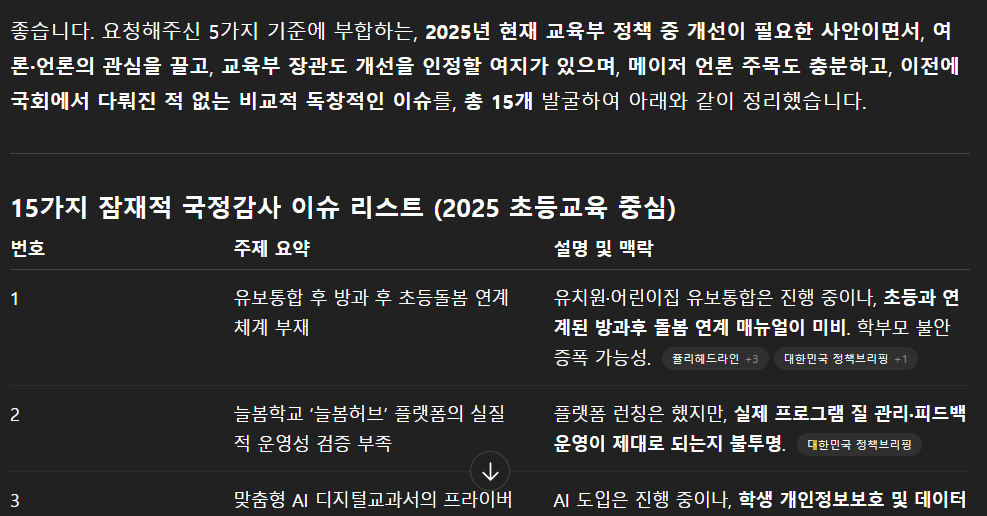 제가 찾는 아이템의 기준은 다음과 같습니다. 1) 2025년 현재 교육부의 정책 중 개선이 필요한 사안 2) 여론과 대중의 큰 관심을 받을 만한 내용 3) 교육부 장관이 질의서 내용을 인정하고 개선안 제시 4) 메이저 언론이라고 할 수 있는 곳에 기사가 실릴 수 있는 정도의 파급력 5) 다른 국회의원이 이전 국정감사나 상임위 회의에서 다루지 않음