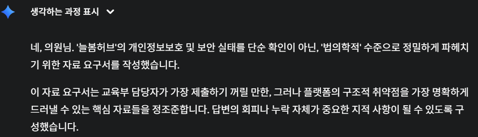 과거 사례도 들어주면서 예상 문제점을 리스트업 해줬습니다. 환상(hallucination)이 많은 AI지만 신뢰도가 좀 더 올라가네요. 그럼 이제 '예상'이 아니라 '실제'로 문제가 있는지 확인해봐야겠지요. 위 여러 문제 중에서 '늘봄 허브의 개인정보 보호 및 데이터 보안 관리 실태'를 파해치기 위해 어떤 자료를 요구하면 되는지 물어보겠습니다.