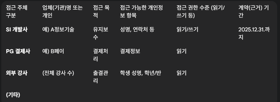 - 요구 취지: 가장 큰 보안 위협 중 하나인 개인정보 처리 위탁업체 및 제3자(외부 강사 등)에 대한 관리·감독 실태를 파악하여 책임 소재를 명확히 하고자 함.