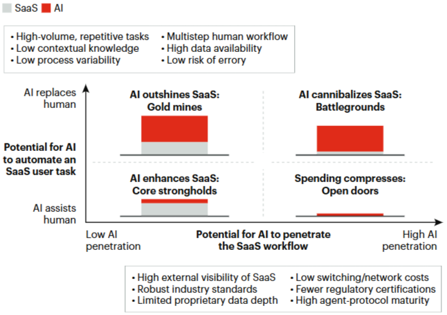 - SaaS(Software as a Service) 기업들은 AI, 특히 agentic AI가 기존의 SaaS 워크플로우를 자동화하거나 대체할 가능성에 직면해 있다.