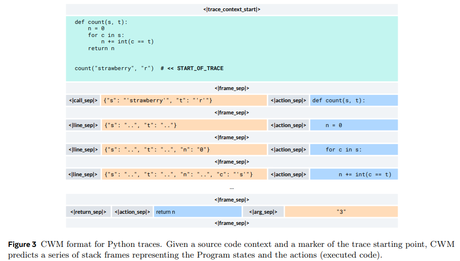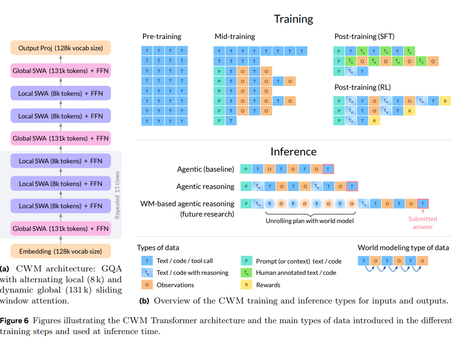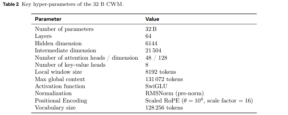 이 교차(local/global) 설계로 CWM은 긴 로그·테스트·커밋 이력 같은 장문맥을 보면서도 계산 효율을 유지할 수 있고, 그 덕에 코드 실행 시뮬레이션(trace prediction)이나 장기 에이전트 RL에 적합한 내부 표현을 학습할 수 있습니다.