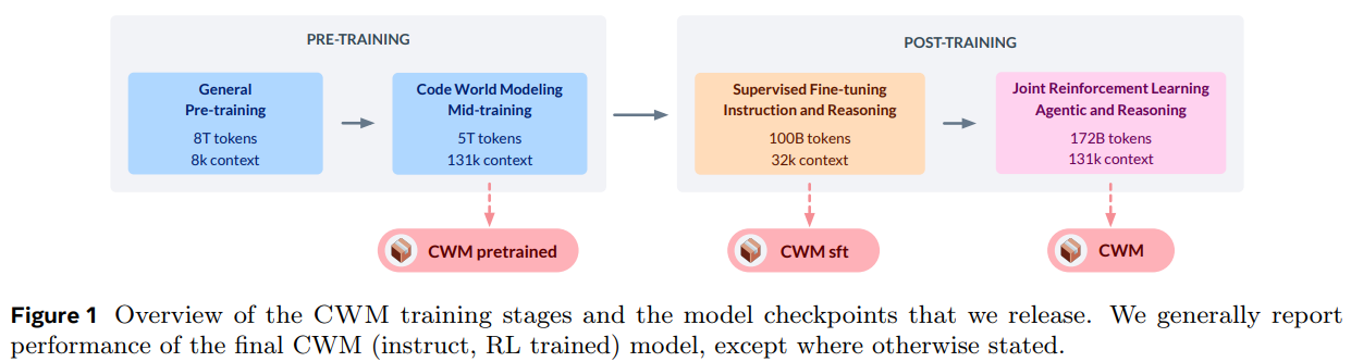 | Date: September 29, 2025 Inference Code: github.com/facebookresearch/cwm Model Weights: http://ai.meta.com/resources/models-and-libraries/cwm-downloads, huggingface.co/facebook/cwm, ../cwm-sft, ../cwm-pretrain |