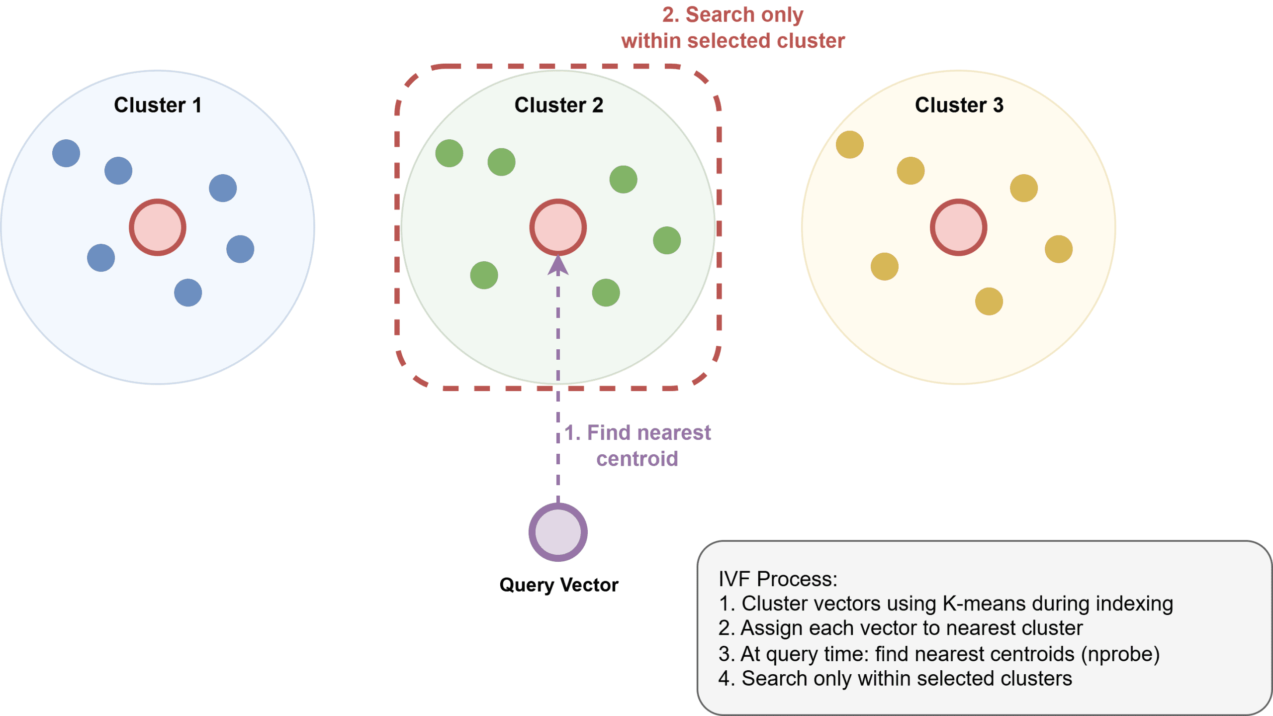 Inverted File Index (IVF) partitions the vector space into regions using clustering algorithms like K-means. During indexing, each vector is assigned to its nearest cluster centroid. During search, you first identify the most relevant clusters, then search only within those clusters.