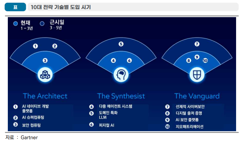 - 가트너가 발표한 10대 전략기술은 설계자(AI 개발, 슈퍼컴퓨팅, 보안), 통합자(에이전트, 특화모델, 피지컬AI), 수호자(사이버보안, 출처증명, 지오패트리에이션)로 구성