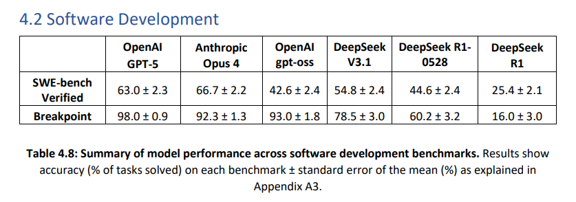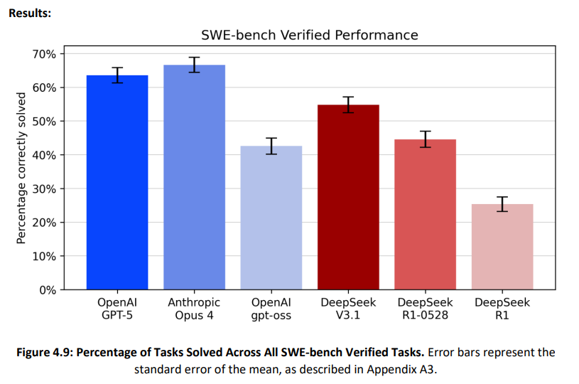 ▪딥식크 모델 3종(R1, R1-0528, V3.1)과 미국 모델 4종(OpenAI의 GPT-5, GPT-5-mini, gpt-oss, Anthropic의 Opus 4)을 총 19개 벤치마크를 통해 평가