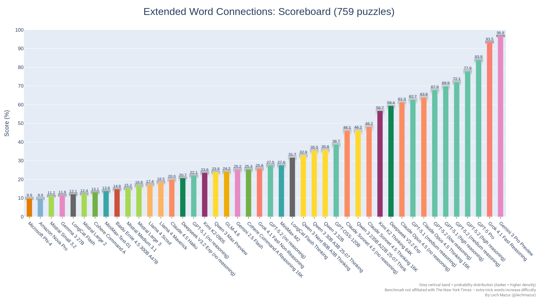 | 1 | Gemini 3 Pro Preview | 96.8 | 759 |