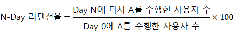 정의: Day 0(처음 A 행동을 한 날)을 기준으로, 정확히 N일째에 다시 A 행동을 한 사용자 비율.
