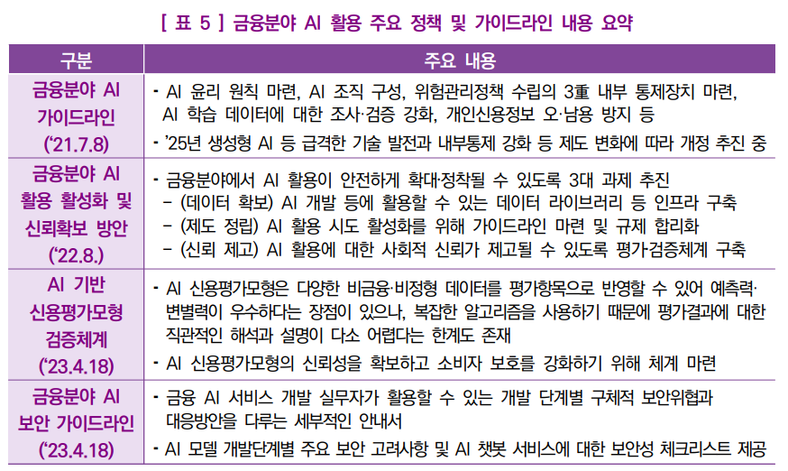 우리나라는 AI 기반 금융 서비스 확산에 따라 규제 샌드박스 확대, AI 금융 가이드라인의 법제화, 데이터 결합·망분리 규제 개선 등을 통해 신뢰성과 활용도를 강화해야 한다. 또한 금융·공공 데이터를 안전하게 결합하여 산업계와 스타트업이 활용할 수 있도록 데이터 인프라를 확충하고, 금융과 AI를 융합한 전문 인재를 양성해야 한다.