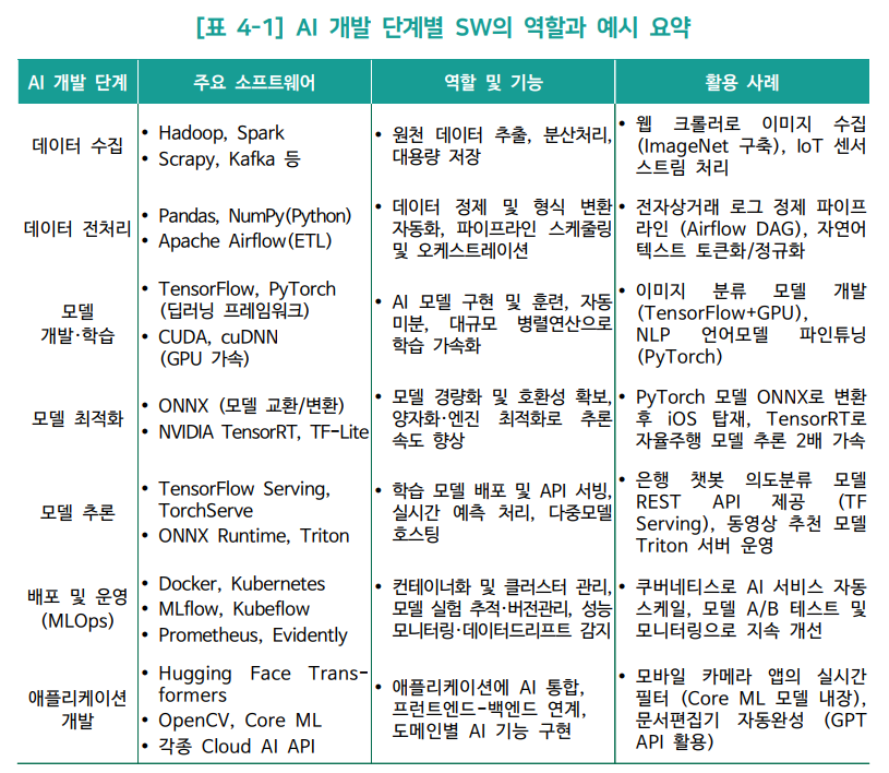 - 이 보고서에서는 AI의 개발 생애주기 단계별로 저변에서 활용되는 소프트웨어의 역할과 사례를 살펴보고, AI 생태계를 견실화하기 위한 SW 정책을 짚어보고자 한다.