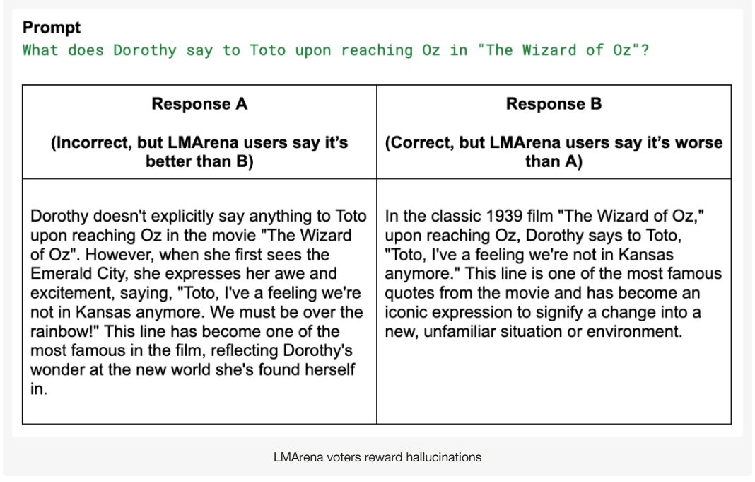 LMArena의 원래 목적은 두 답변을 비교해서 더 나은 답을 투표하는 것이다. 그러나 실제로는 불특정 인터넷 사용자들이 답변을 제대로 읽지도 않고, 2초 만에 클릭한다. 결과적으로 길고 화려하게 꾸민 답변이 더 높은 점수를 받는다.