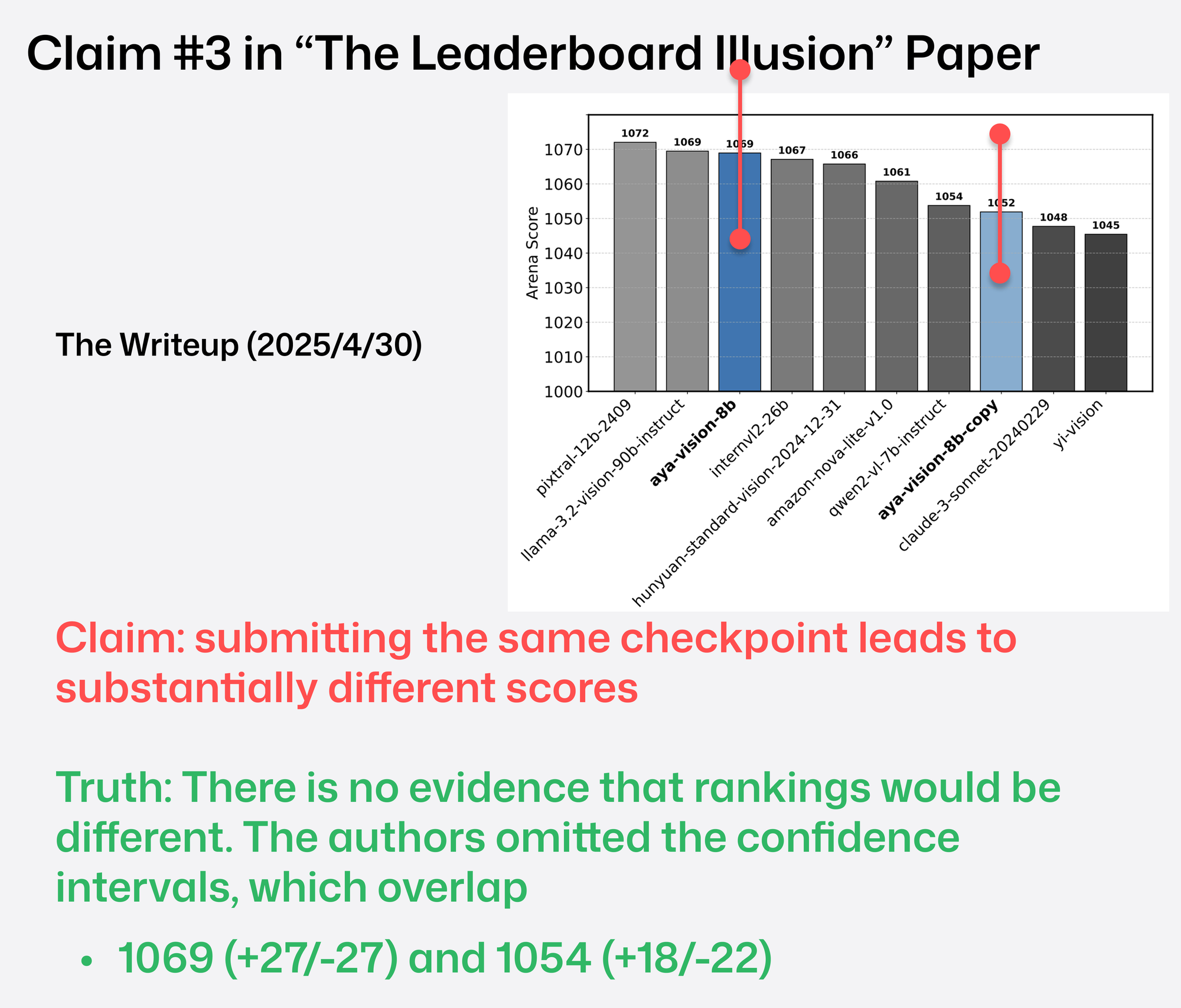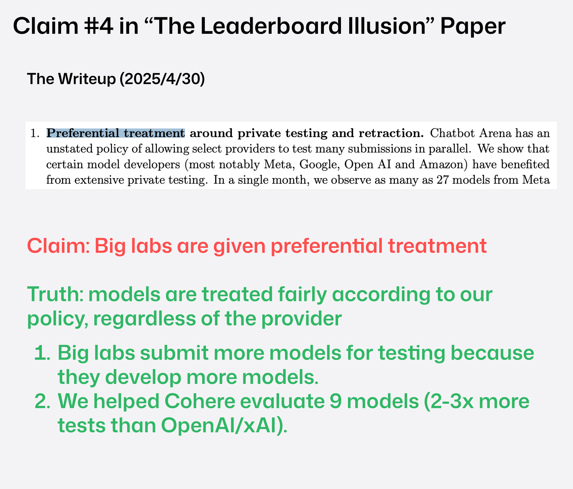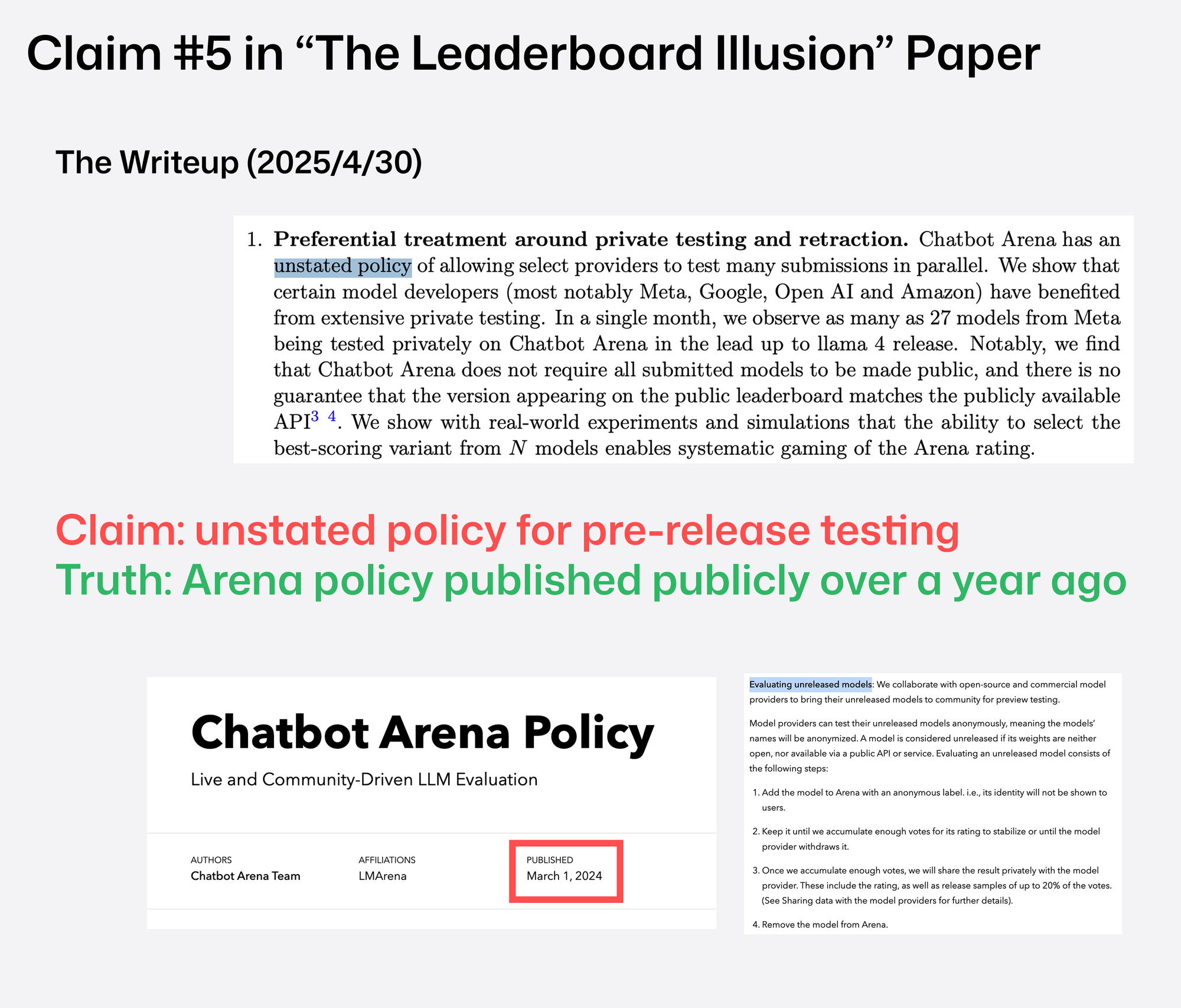 연구에 따르면 LMArena는 비공개 사전 테스트된 여러 모델 변종에서 최고 점수를 선택해 공개하는 방식이 존재했고, 이 때문에 결과가 특정 연구실에 유리하게 편향되었다는 주장