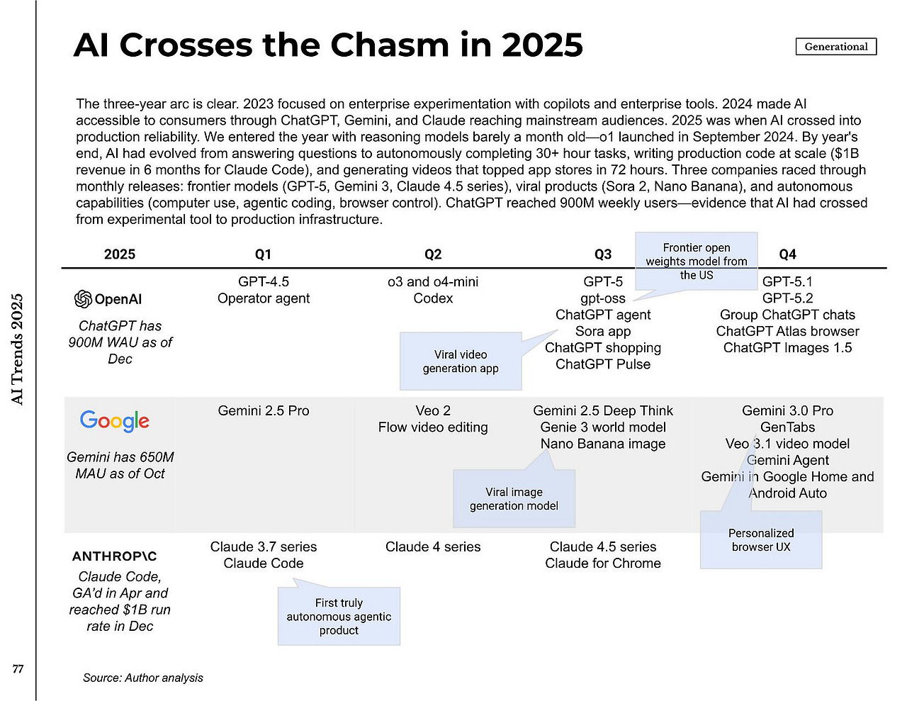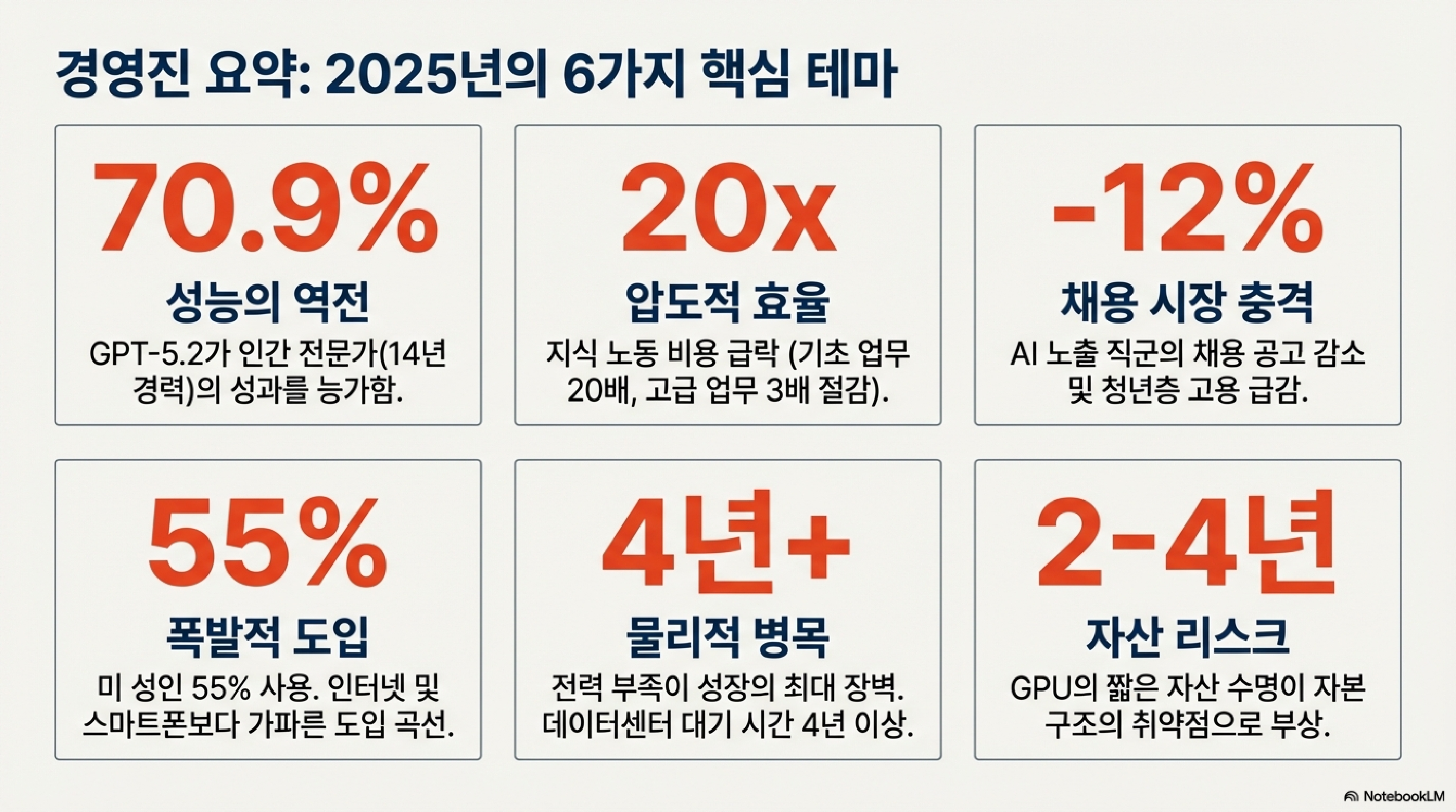 이 자료는 인공지능 기술이 단순한 실험 단계를 넘어 주류 경제의 핵심 동력으로 자리 잡았음을 알리는 2025년 동향 보고서입니다. 최신 AI 에이전트들이 전문직 종사자의 업무 능력을 상회하며 실질적인 고용 시장의 변화와 비용 절감을 이끌어내고 있다는 점을 강조합니다. 하지만 급격한 성장세 속에서 에너지 공급 부족이 기술 발전의 최대 걸림돌로 부상하고 있으며, 기업들은 전력 확보를 위해 자체 발전 시설까지 고려하는 상황입니다. 또한 챗GPT와 같은 서비스의 압도적인 대중화 속도와 더불어, 신생 기업들이 상장보다는 대기업에 인수되는 방식의 시장 재편 양상을 설명합니다. 저자는 자산 가치 하락 위험과 금융 구조의 불안정성을 경고하면서도, 고임금 직종을 대체하는 자동화 기술이 향후 스타트업 성장의 중심축이 될 것이라고 전망합니다. 결과적으로 이 보고서는 AI가 가져온 산업 구조의 거대한 전환점과 물리적 한계를 종합적으로 분석하고 있습니다.