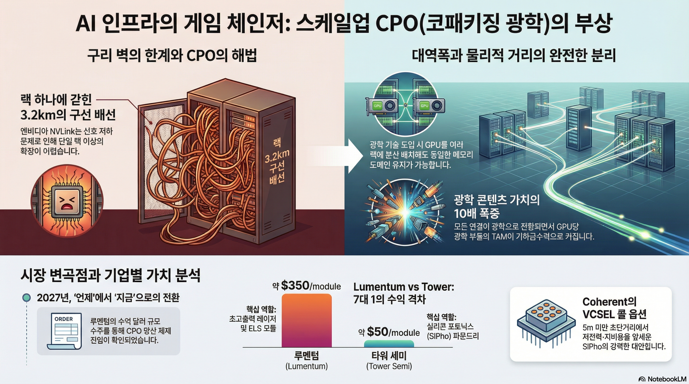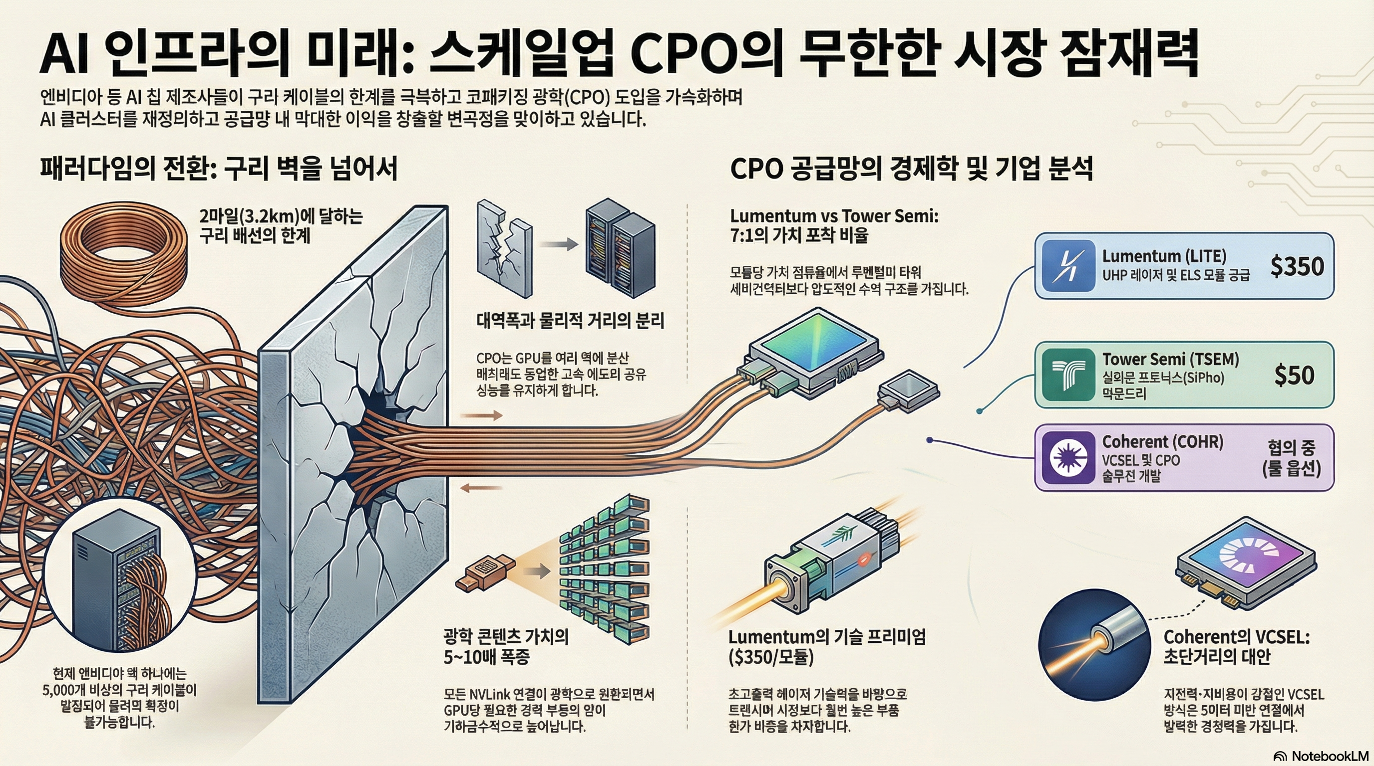이 자료는 구리 배선의 물리적 한계를 극복하기 위해 반도체 업계가 코패키징 광학(CPO) 기술로 급격히 전환하고 있는 현황을 분석합니다. 데이터 센터 내 GPU 간 연결 거리를 획기적으로 늘려주는 스케일업 CPO는 기존 시장을 압도할 거대한 성장 잠재력을 지닌 것으로 평가됩니다. 특히 루멘텀은 핵심 광원 부품에서 높은 수익 구조를 확보하며 시장 변화의 최대 수혜주로 주목받고 있습니다. 타워 세미컨덕터와 코히어런트 역시 각각 실리콘 포토닉스 제조와 차세대 전력 효율 기술인 VCSEL을 통해 독자적인 영역을 구축하고 있습니다. 결론적으로 이 텍스트는 엔비디아 등 주요 기업의 수요에 힘입어 CPO 공급망이 단순한 기대를 넘어 실질적인 대량 생산 단계에 진입했음을 강조합니다.