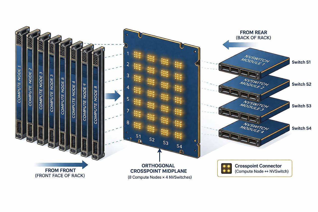 GPU는 전면에서 수직으로 장착되고, NVSwitch 모듈은 후면에서 수평으로 장착됩니다. 두 모듈은 중앙에서 직교하는 중간면을 통해 만납니다. 매우 컴팩트한 설계로 공간을 절약할 수 있습니다!