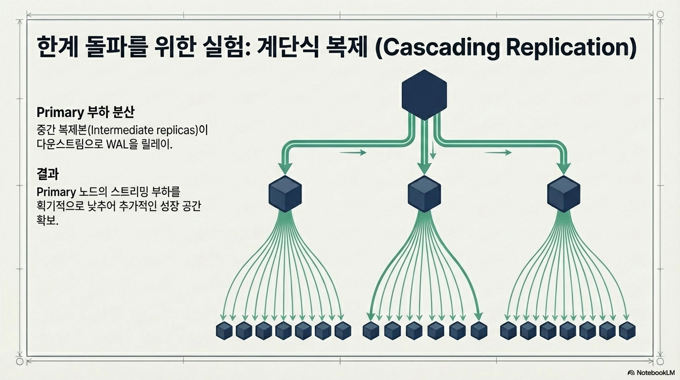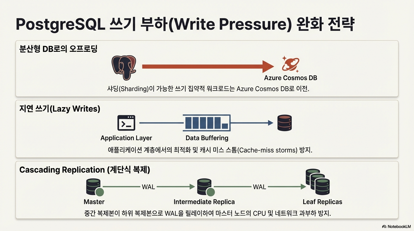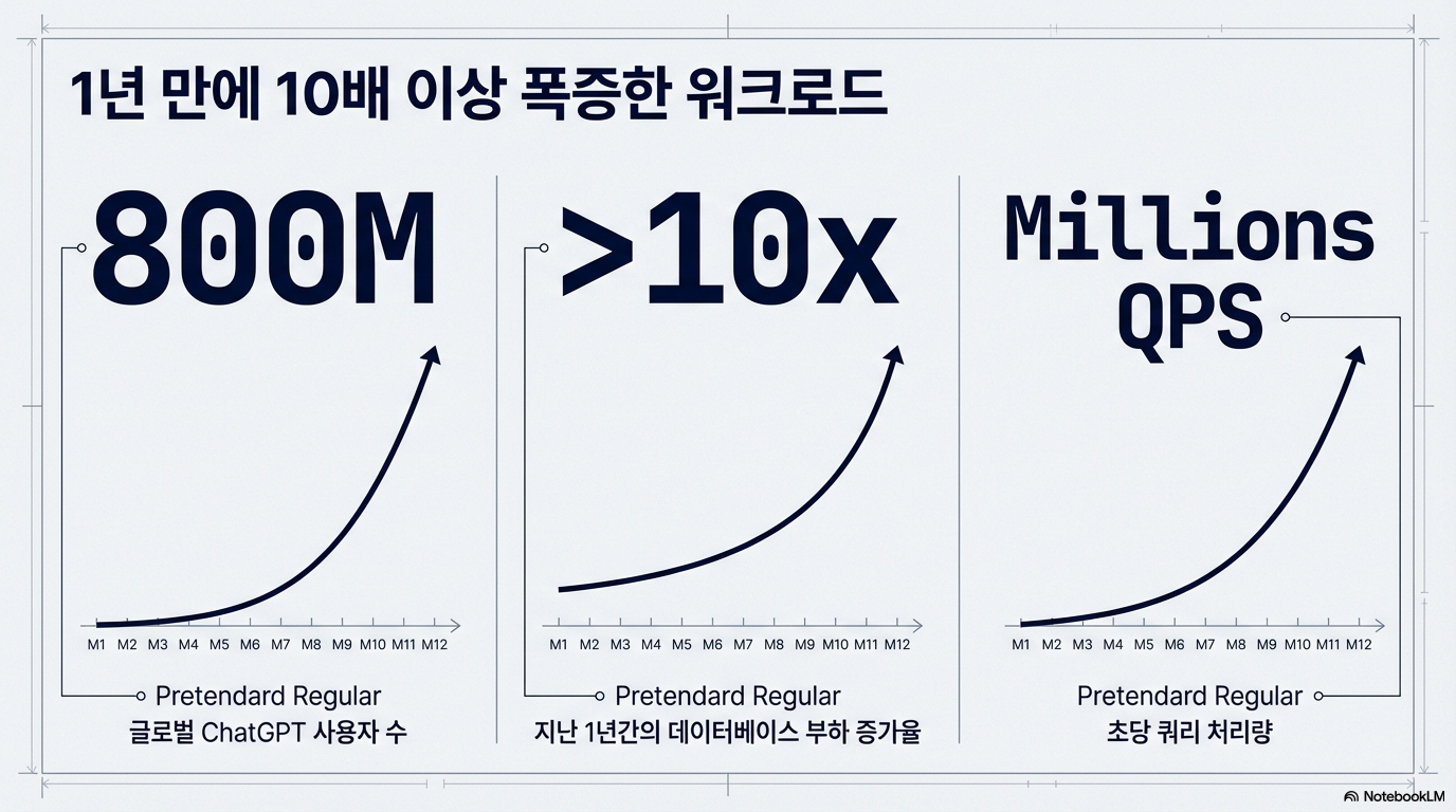 OpenAI가 ChatGPT의 폭발적인 성장을 뒷받침하기 위해 단일 주 데이터베이스(Single Primary Instance) 환경에서 PostgreSQL을 어떻게 수만 대의 기기 수준으로 확장했는지 그 기술적 여정을 다룹니다. 시스템 부하가 10배 이상 증가함에 따라, 이들은 전 세계에 분산된 약 50개의 읽기 전용 복제본(Read Replicas)과 카스케이딩 복제 방식을 도입하여 낮은 지연 시간을 유지하는 데 성공했습니다. 또한 쓰기 작업의 압박을 줄이기 위해 관계형 데이터가 불필요한 작업은 샤딩된 시스템인 Azure Cosmos DB로 이전하고, 애플리케이션 계층에서 쿼리를 최적화하는 등 하이브리드 전략을 취했습니다. 결과적으로 이 텍스트는 단일 기본 노드의 한계를 극복하기 위한 운영 가드레일과 연결 풀링, 그리고 데이터베이스 부하 분산의 구체적인 설계 방법론을 제시하는 데 목적이 있습니다.