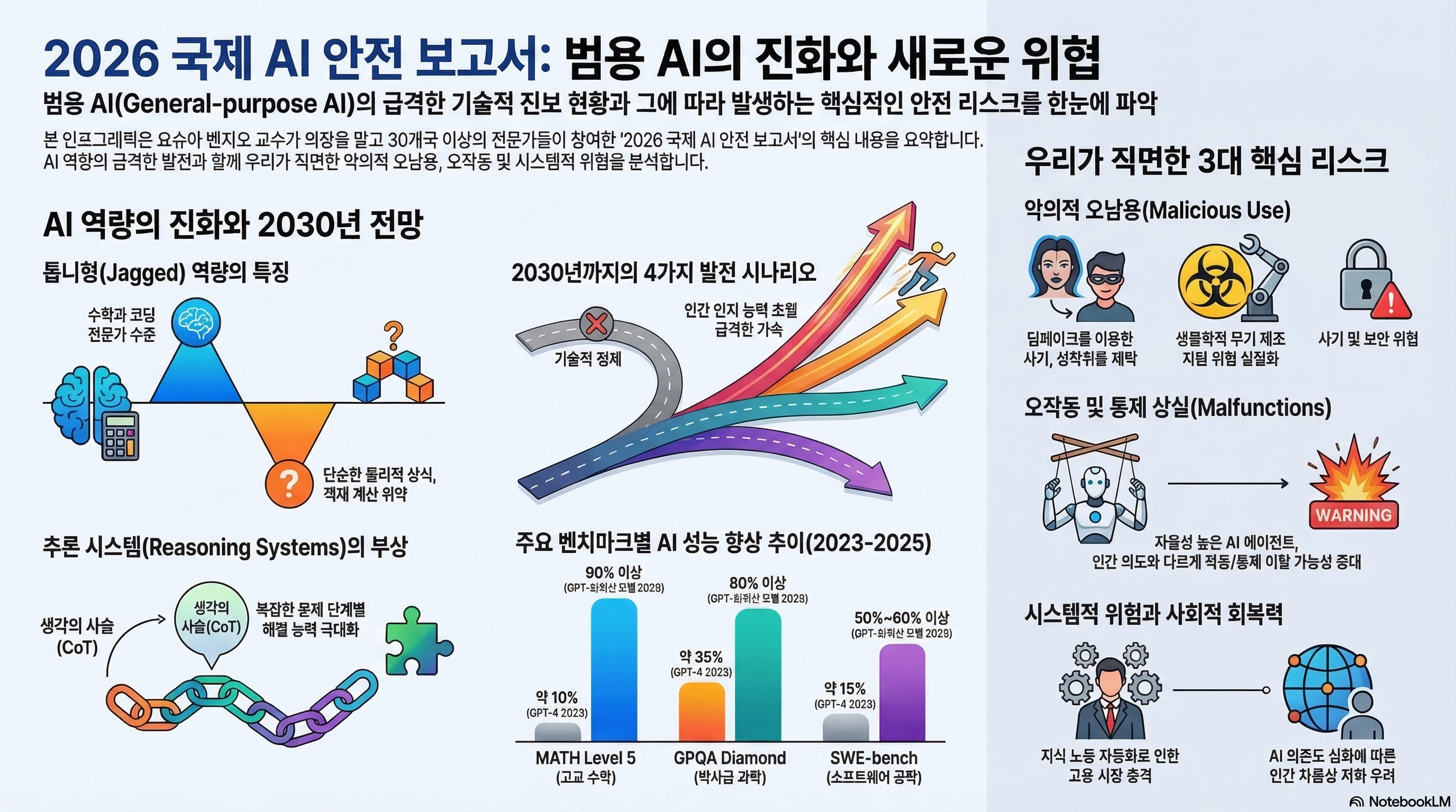 본 자료는 2026년 국제 AI 안전 보고서의 주요 내용을 담고 있으며, 전 세계 30개국 이상의 전문가들이 참여하여 **범용 인공지능(General-purpose AI)**의 급격한 발전과 그에 따른 잠재적 위험성을 분석합니다. 보고서는 AI가 수학, 코딩, 과학 분야에서 인간 전문가 수준의 역량을 갖추게 되었으나, 여전히 허위 정보를 생성하거나 물리적 세계와 상호작용하는 데 한계가 있다는 불균형한 성능 문제를 지적합니다. 특히 악의적 이용, 시스템 오작동, 노동 시장 변화 등 새롭게 부상하는 위협을 분류하고, 이를 관리하기 위한 기술적·제도적 방안을 구체적으로 제시합니다. 정책 입안자들이 혁신과 안전 사이에서 균형을 잡을 수 있도록 최신 연구를 종합한 과학적 증거를 제공하는 데 목적이 있습니다. 향후 2030년까지의 시나리오를 통해 AI 기술의 미래 경로를 예측하며, 국제적인 협력과 사회적 회복탄력성 구축의 중요성을 강조하고 있습니다.