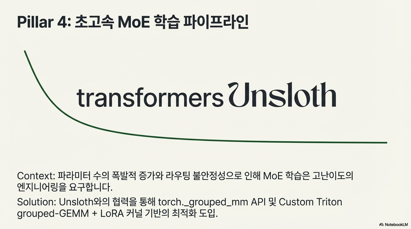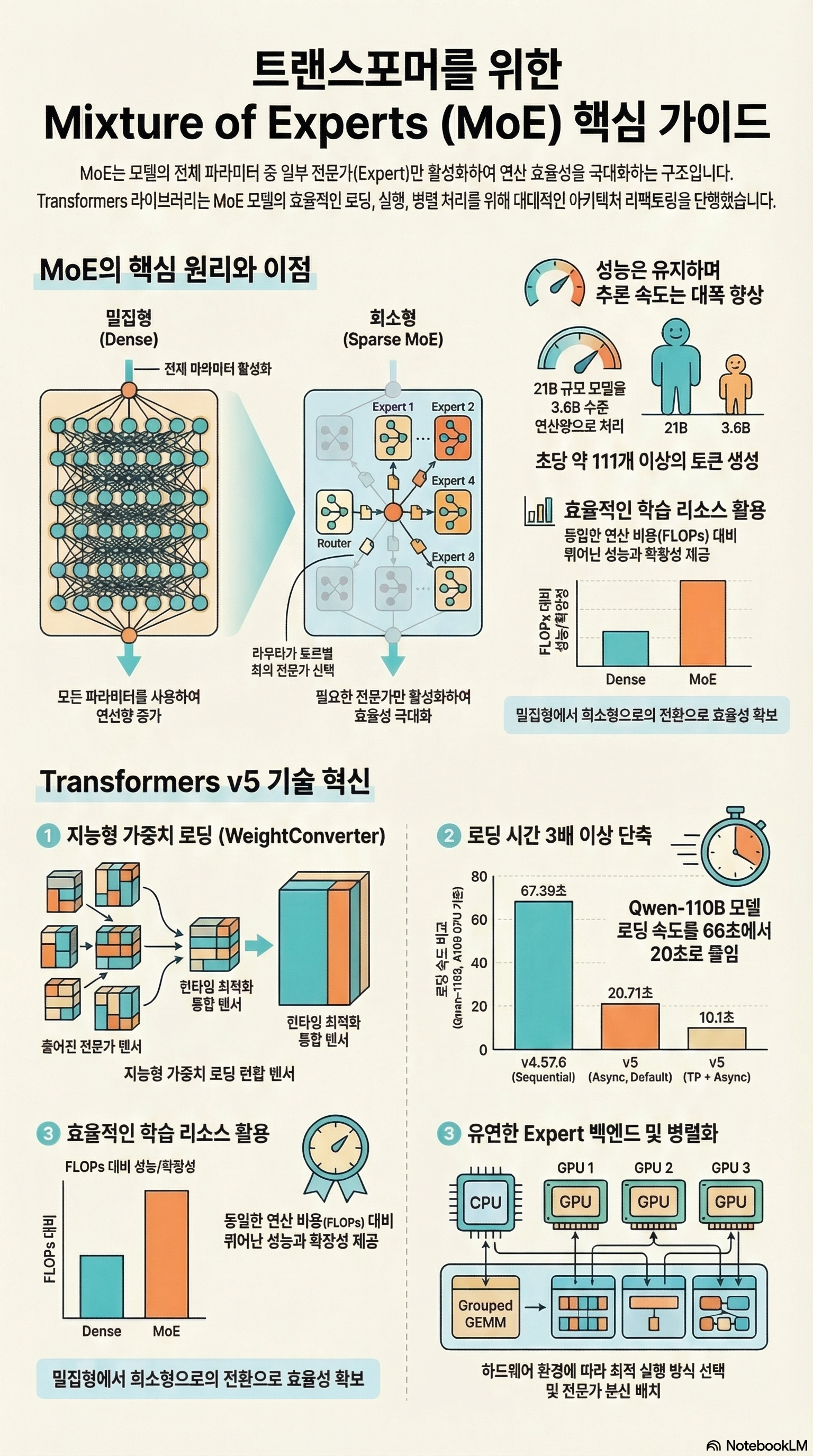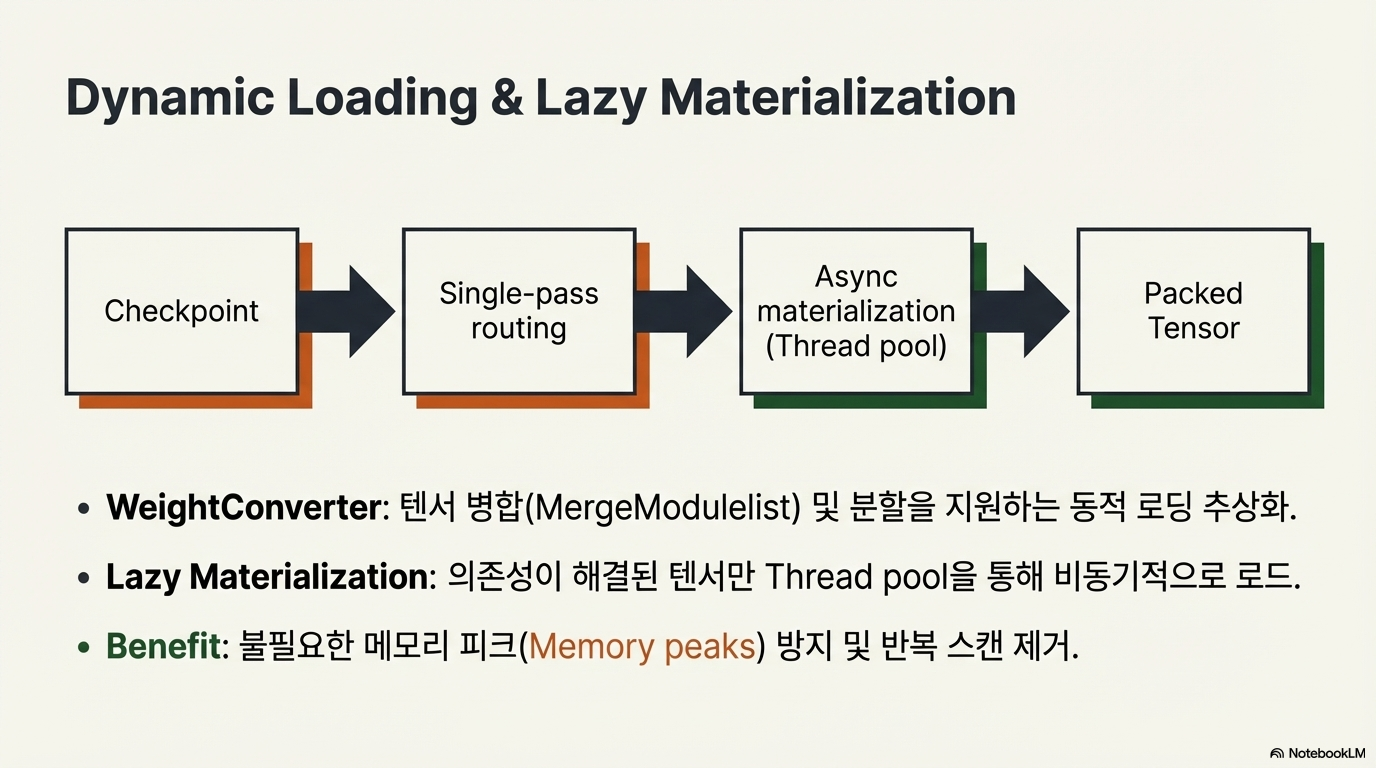 이 문서는 Hugging Face의 Transformers 라이브러리가 Mixture of Experts (MoEs) 모델을 효율적으로 지원하기 위해 도입한 기술적 혁신을 다룹니다. 기존의 밀집형 모델과 달리 MoE는 특정 토큰에 필요한 전문가 네트워크만 활성화하여 연산 효율성과 모델 용량을 동시에 확보합니다. 이를 위해 라이브러리는 가중치 로딩 파이프라인을 재설계하여 병렬 처리와 메모리 최적화를 달성했으며, 다양한 전문가 백엔드를 통해 실행 속도를 높였습니다. 또한 전문가 병렬화 기술을 도입해 초거대 모델을 여러 장치에 분산 처리할 수 있도록 구조를 개선했습니다. 결과적으로 이러한 업데이트는 MoE 모델의 학습 및 추론 성능을 획기적으로 향상시켜 더 적은 비용으로 고성능 언어 모델을 운용하게 해줍니다.