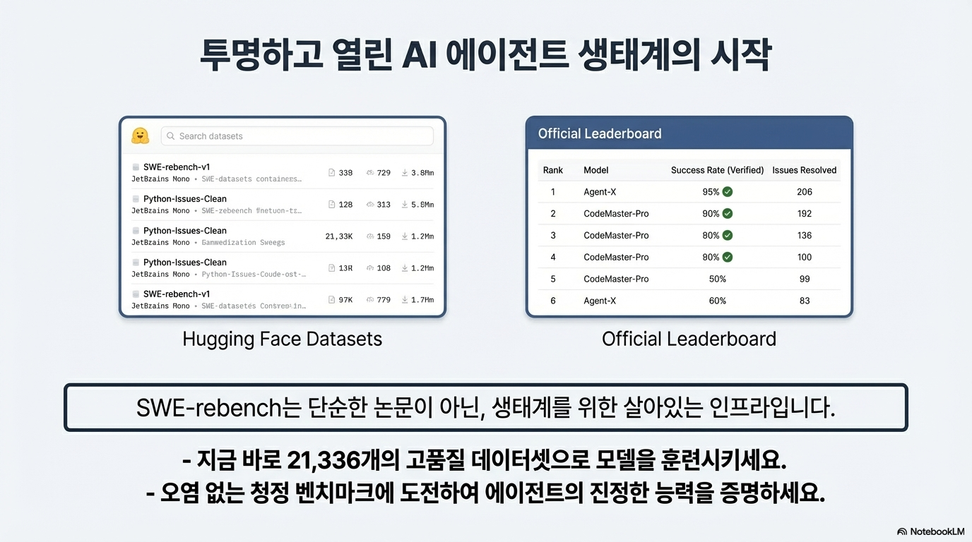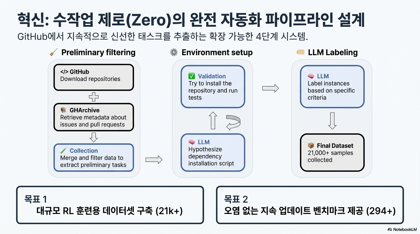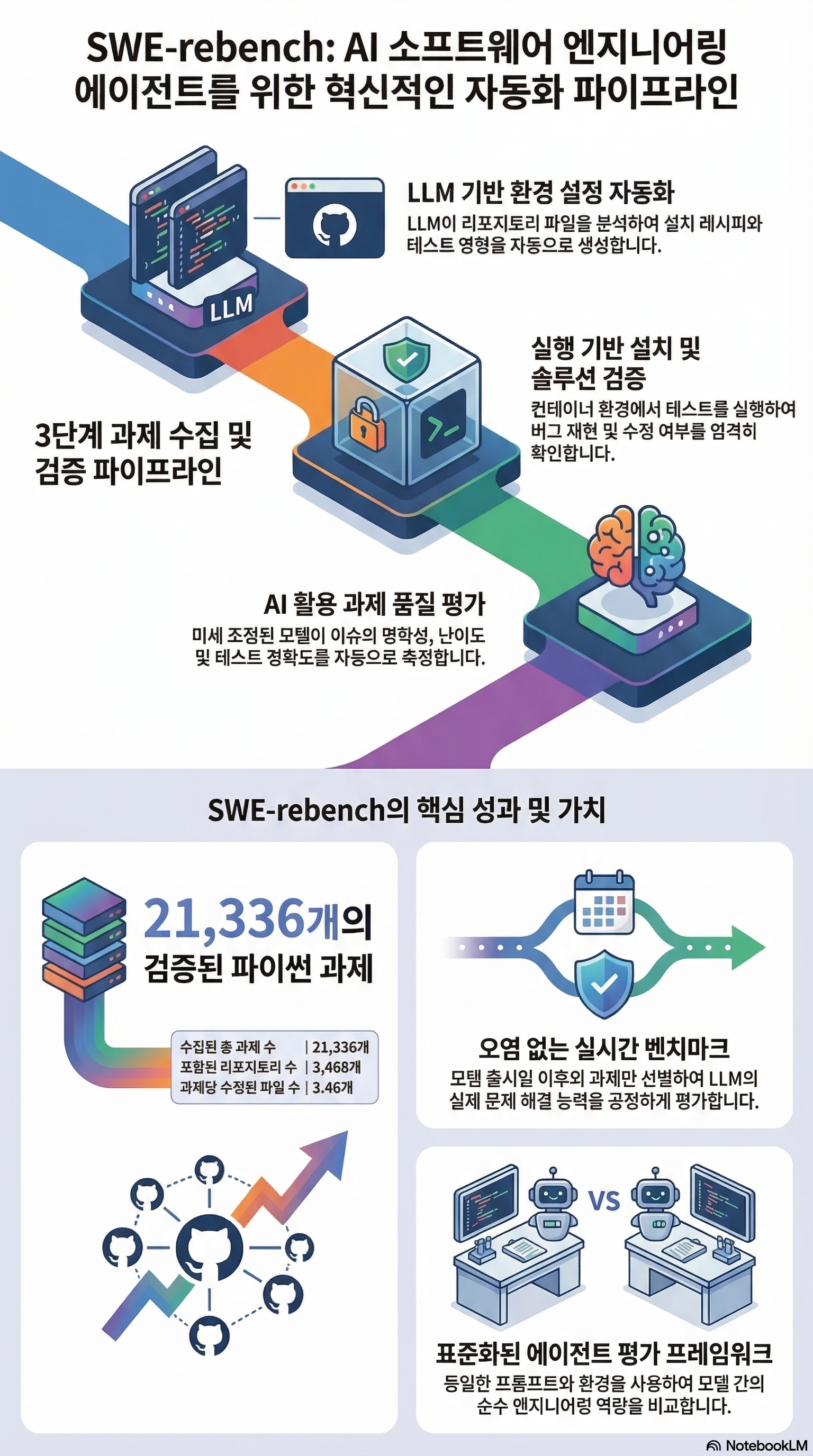 이 자료는 대규모 언어 모델(LLM) 기반 소프트웨어 공학 에이전트의 성능을 개선하고 평가하기 위한 SWE-rebench 파이프라인과 데이터셋을 소개합니다. 연구진은 기존 벤치마크의 데이터 오염 문제와 수동 구축의 한계를 해결하기 위해, GitHub에서 실제 과업을 지속적으로 추출하고 검증하는 완전 자동화된 시스템을 개발했습니다. 이를 통해 구축된 21,000개 이상의 파이썬 기반 과업은 에이전트의 강화 학습 및 정밀한 성능 측정에 활용됩니다. 또한, 최신 모델들을 대상으로 한 실험 결과, 일부 모델의 높은 성적이 과거 데이터에 대한 암기 효과일 수 있음을 시사하며 표준화된 평가 환경의 중요성을 강조합니다. 결론적으로 이 논문은 에이전트의 실질적인 문제 해결 능력을 투명하고 공정하게 비교할 수 있는 동적 벤치마크 시스템을 제안합니다.