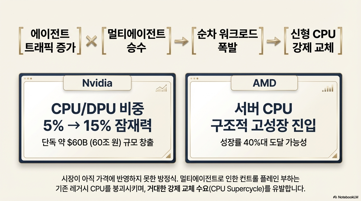 최근 인공지능 인프라는 병렬 연산 중심의 GPU 시대에서 벗어나 복잡한 논리 제어를 수행하는 매니코어 CPU 중심으로 재편되고 있습니다. 멀티 에이전트 시스템이 보편화되면서 실시간 의사결정과 빈번한 컨텍스트 스위칭을 처리하기 위해 강력한 순차 제어 능력이 핵심 경쟁력이 되었기 때문입니다. 이에 따라 데이터센터 설계 방식 또한 연산과 제어 장치를 분리하는 디스어그리게이션 아키텍처로 진화하며 물리적 구조의 근본적인 변화를 맞이하고 있습니다. 주요 하이퍼스케일러들은 비용 효율을 위해 맞춤형 실리콘을 도입 중이며, 인텔과 AMD 같은 전통의 강자들은 기술 혁신을 통해 시장 점유율 확보에 사활을 걸고 있습니다. 엔비디아 역시 독자적인 프로세서 설계와 공간적 멀티스레딩 기술을 앞세워 CPU 시장까지 영향력을 확대하며 주도권을 방어하는 추세입니다. 이러한 하드웨어 패러다임의 전환은 단순한 성능 개선을 넘어 향후 데이터센터 시장의 거대한 투자 기회를 창출할 것으로 전망됩니다.
