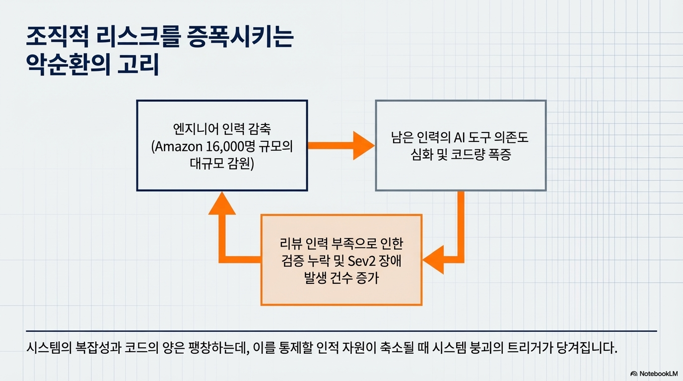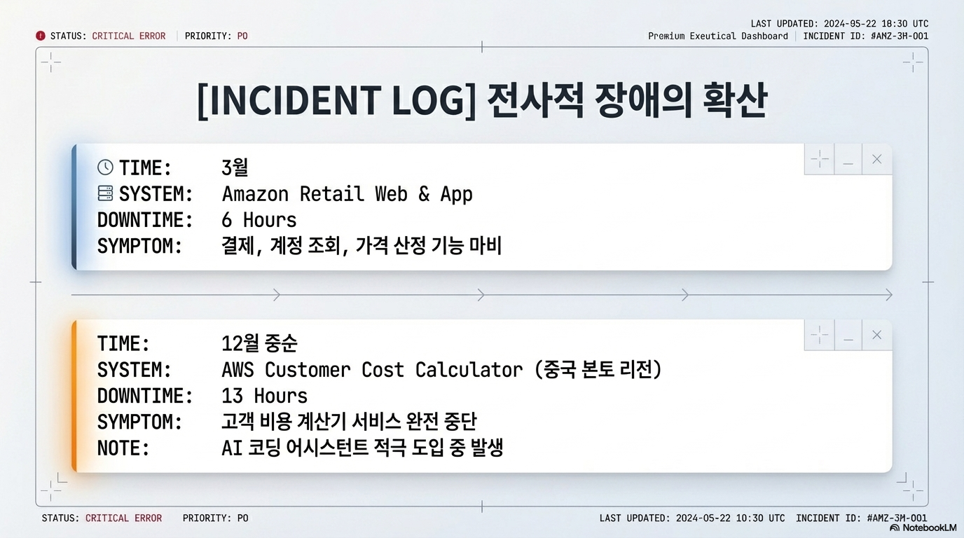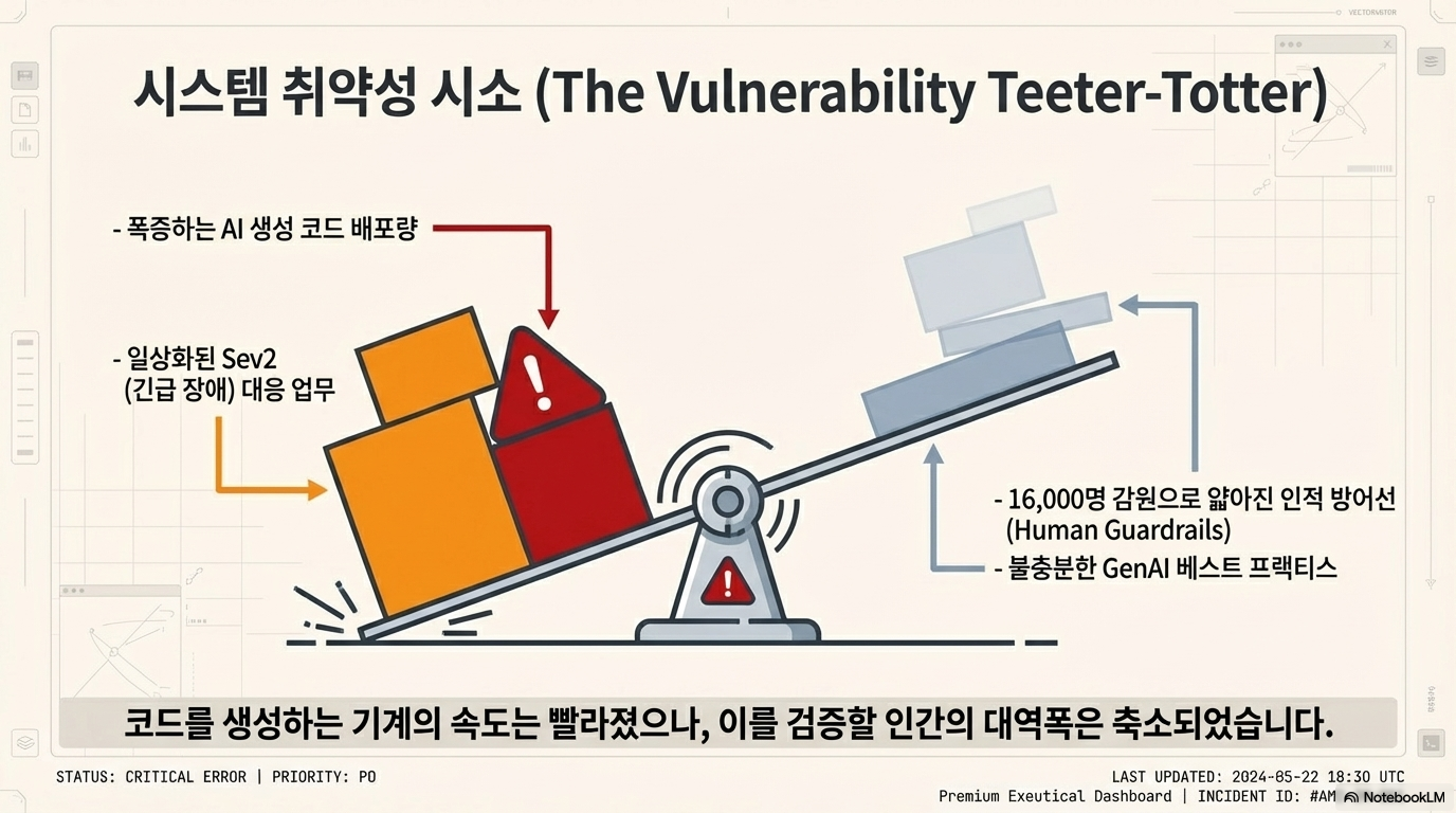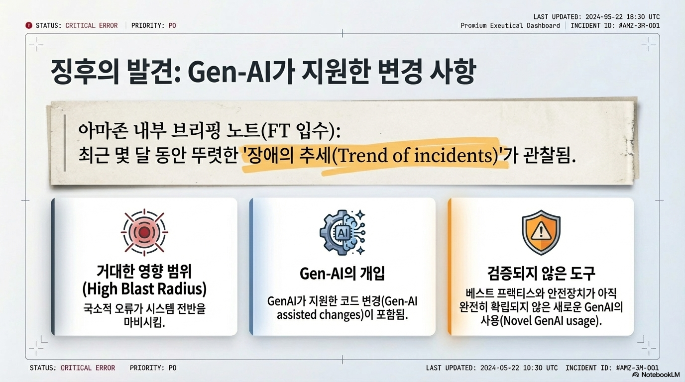 최근 Amazon은 여러 차례의 서비스 장애(outage)를 겪었으며, 일부 장애는 생성형 AI가 생성하거나 수정한 코드 변경(Gen-AI assisted changes)과 관련된 것으로 분석되었다. 이 사건 이후 Amazon은 AI가 관여한 코드 변경은 반드시 시니어 엔지니어가 검토(sign-off)하도록 하는 정책을 도입하기로 했다.